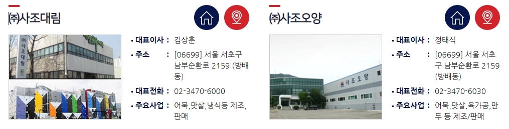 대림선(맛살, 어묵), 사조오양(맛살, 냉동식품, 햄 등), 사조씨푸드(횟감용 참치 등)
